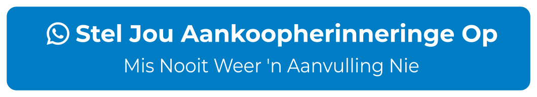 Wanneer jy op die knoppie hieronder klik en jou persoonlike aankoopherinneringe op WhatsApp opstel, neem ons die verantwoordelikheid op om jou vriendelik te herinner elke keer as jy jou eenhede moet aanvul.